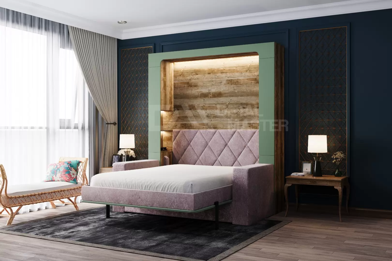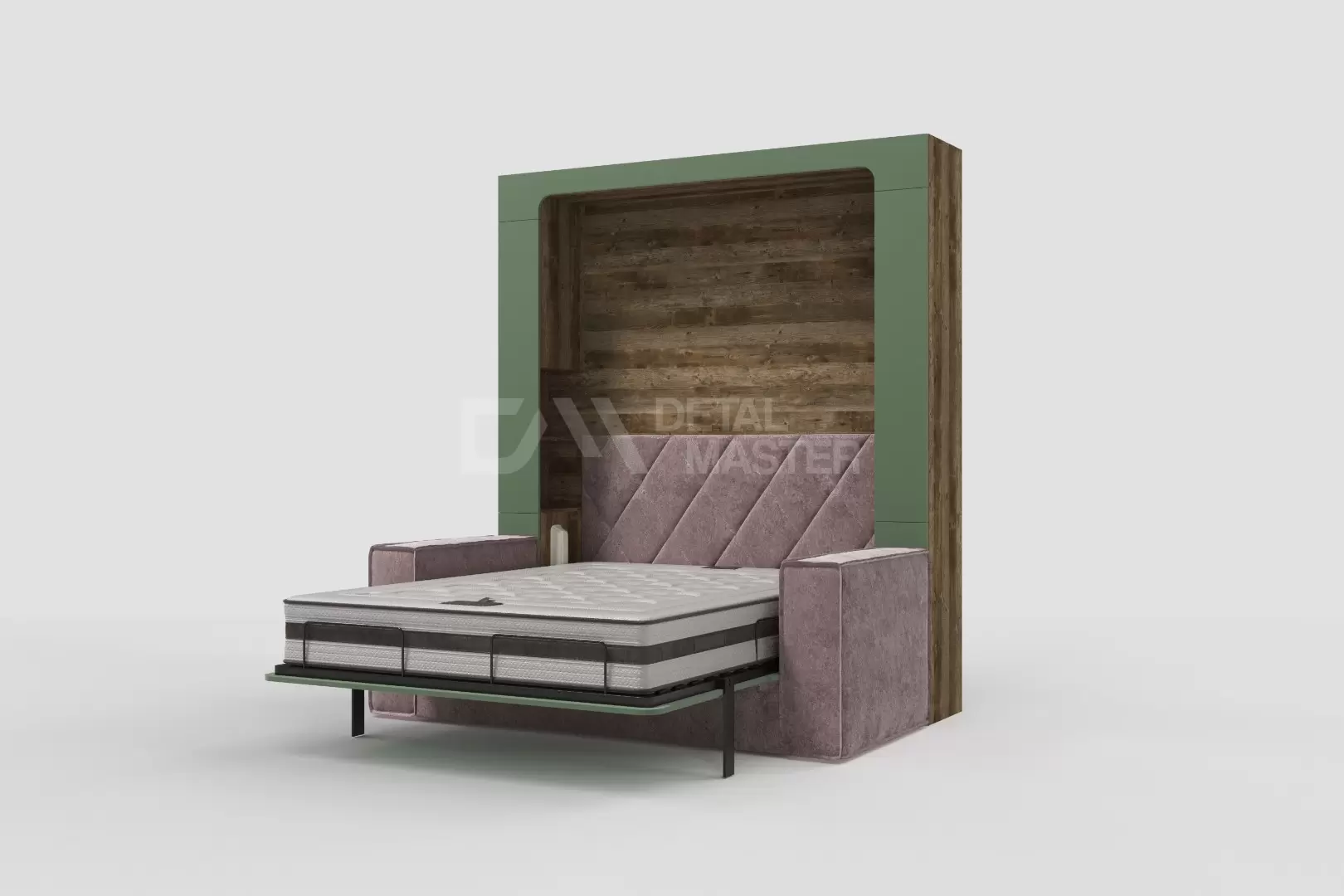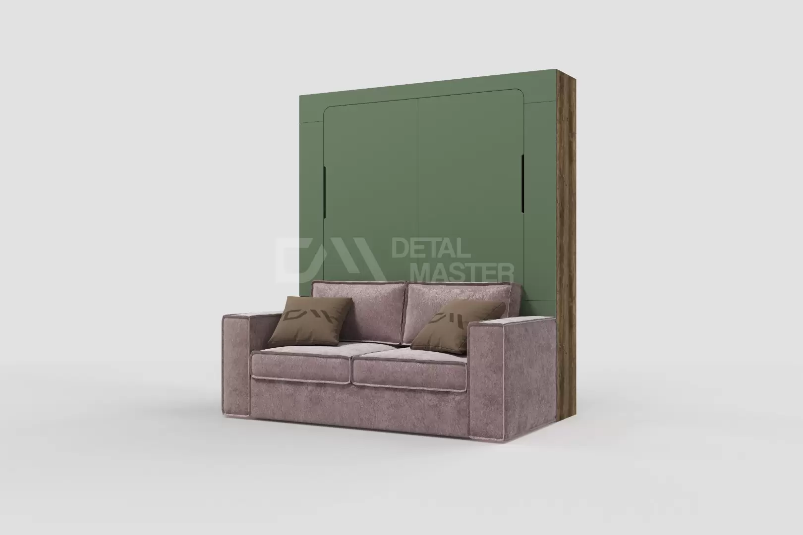 Фасад шкаф-кровати выполнен из МДФ супер матовый Фисташка, со сглаженными краями. Что позволит обезопасить вас от ударов при ходьбе возле кровати в разложенном положении и добавит изысканность модели шкаф-кровати. Корпус выполнен из ЛДСП декор Кейптаун. По бокам модель оснащена полками для хранения вещей с закрывающимися дверцами.
