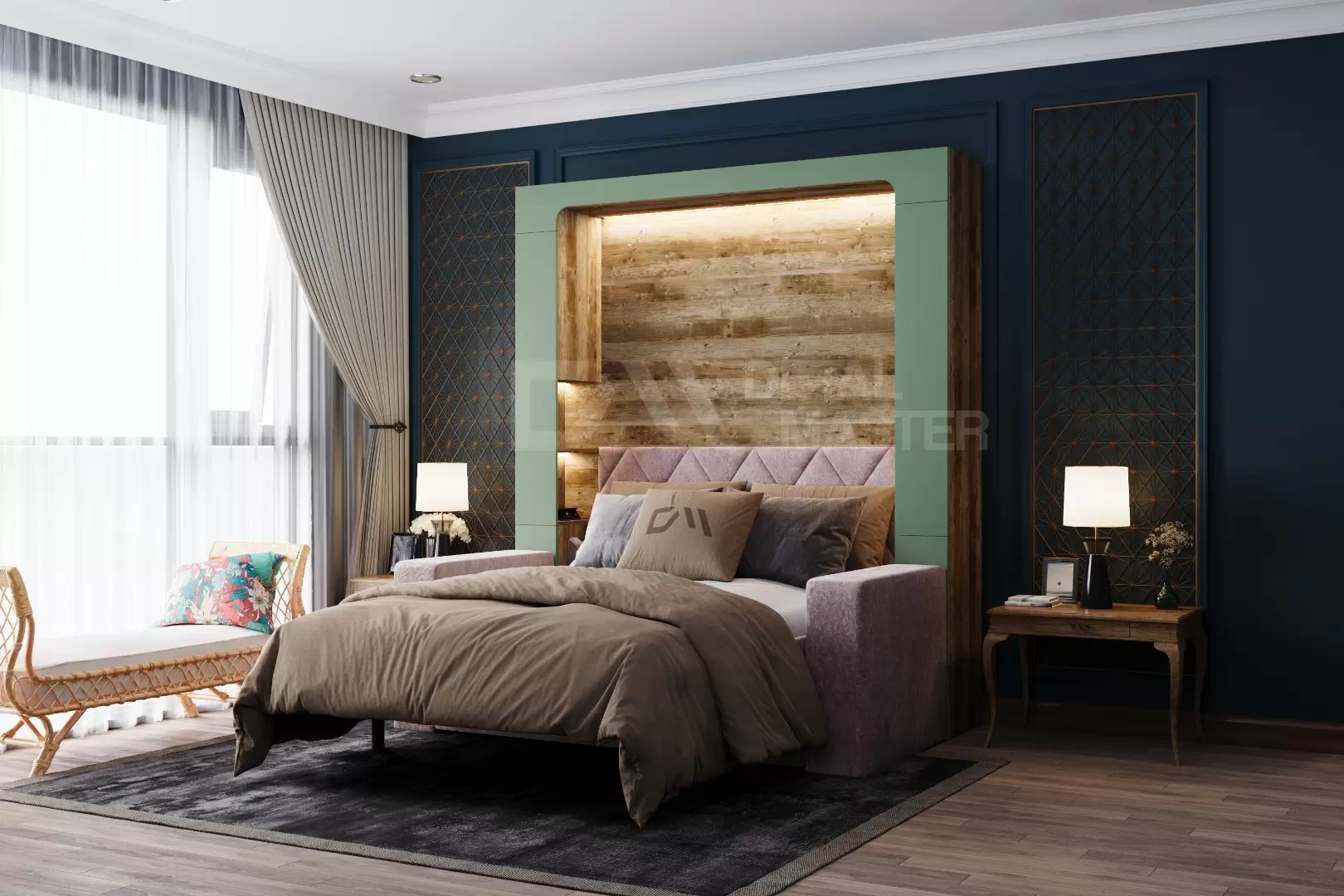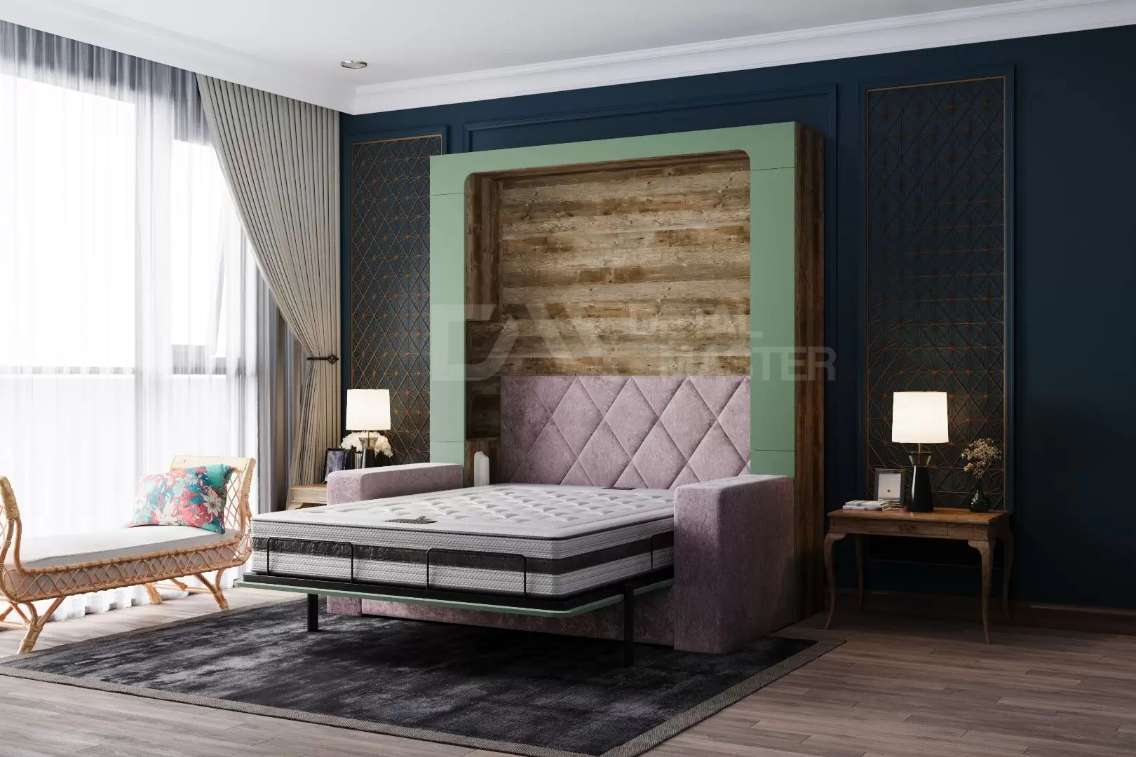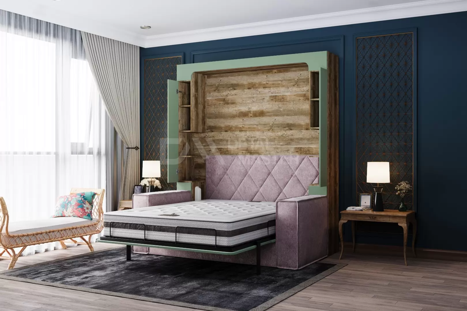Фасад шкаф-кровати выполнен из МДФ супер матовый Фисташка, со сглаженными краями. Что позволит обезопасить вас от ударов при ходьбе возле кровати в разложенном положении и добавит изысканность модели шкаф-кровати. Корпус выполнен из ЛДСП декор Кейптаун. По бокам модель оснащена полками для хранения вещей с закрывающимися дверцами.